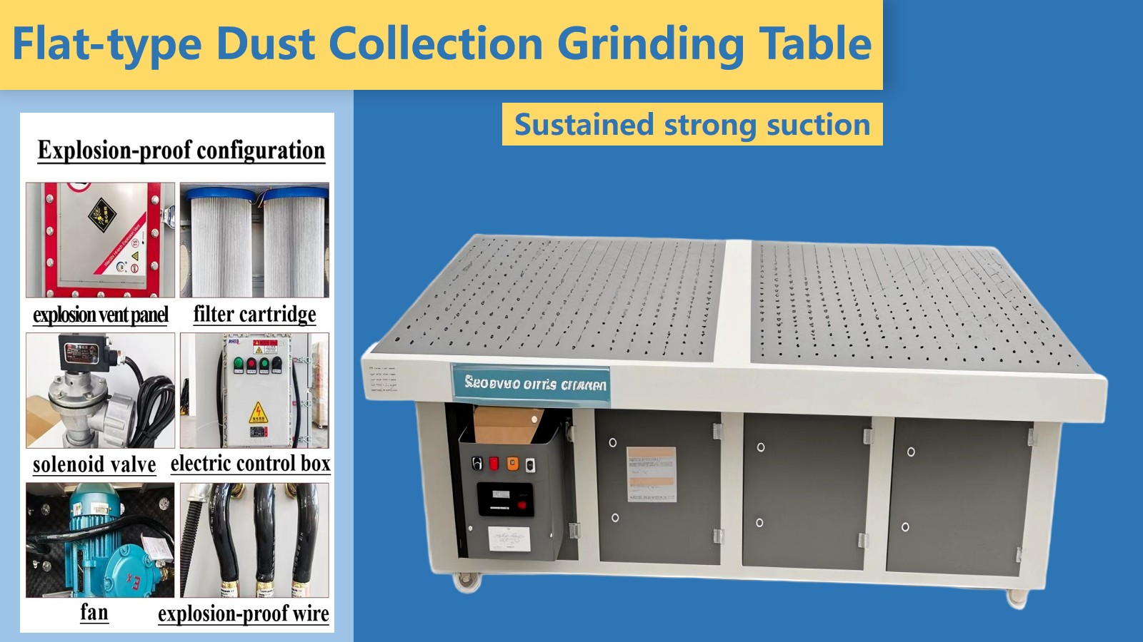 تأثير جيد لجمع الغبار: تم تجهيز المستوى وجانب طاولة الصنفرة المسطحة للغبار بمنافذ شفط يمكنها إزالة الغبار من اتجاهات متعددة وتحسين كفاءة جمع الغبار.