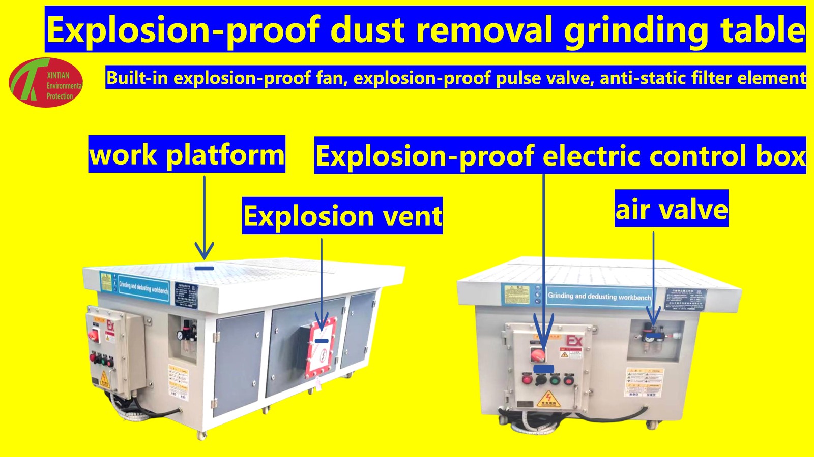 صديقة للبيئة وفعالة: يمكن لطاولة الصنفرة المسطحة الممتصة للغبار إزالة الغبار من مصدر الطحن، والتحكم بشكل فعال في تشتت الغبار، وتقليل تلوث الغبار بالبيئة والإضرار بصحة المشغلين.