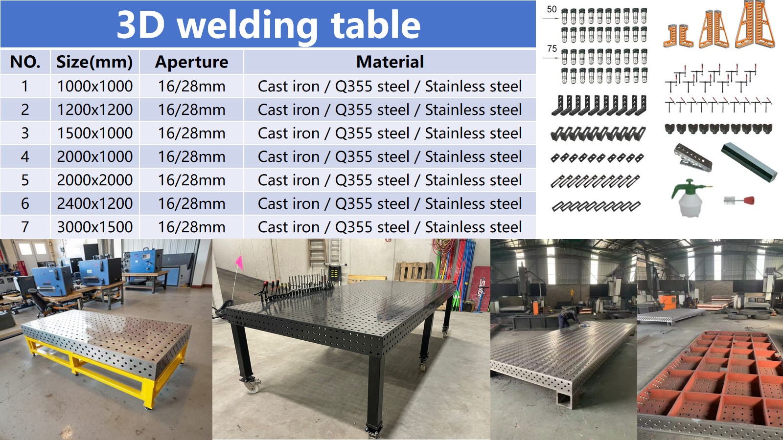 ورش العمل/الإصلاح الصغيرة: اختر طرازًا أساسيًا بقطر ثقب الطاولة 16 مم، وحجم قابل للتخصيص، وسعة تحميل تتراوح بين 500-1000 كجم لتلبية احتياجات اللحام المتفرقة ومعالجة الأجزاء الصغيرة.